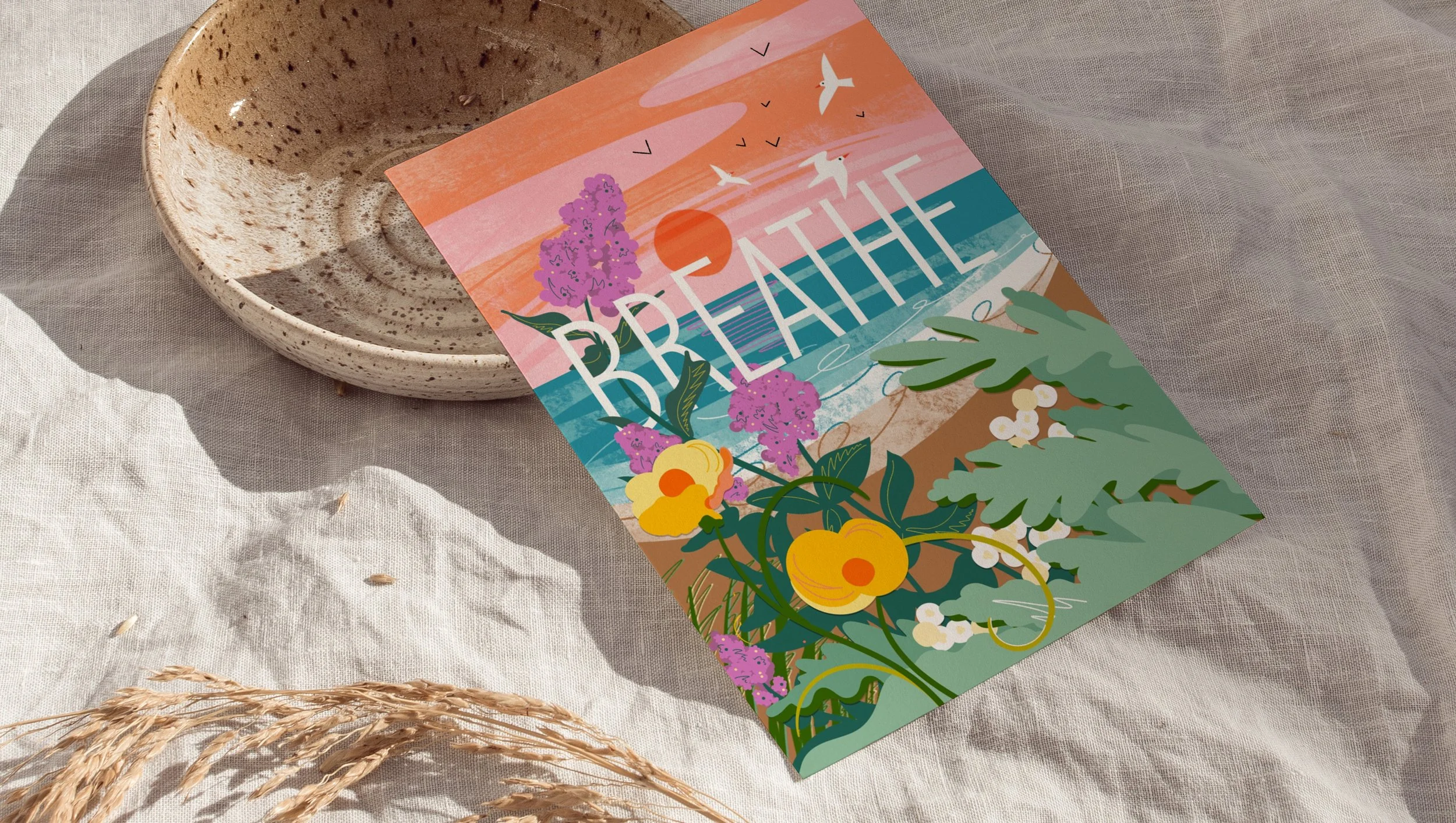 Whispers is a mindful greeting card collection inspired by quiet moments in nature. Each card features a single word paired with an illustrated landscape, offering a gentle invitation to pause, breathe or explore. Designed to be sent for a wide range of occasions, the cards work equally well for comfort, encouragement or celebration.